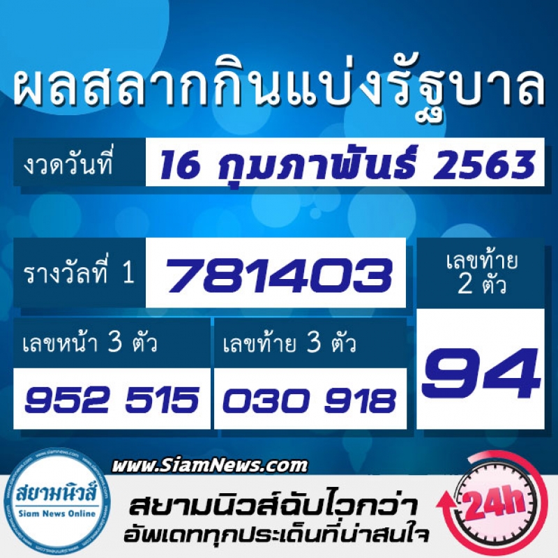 ออกไปเป็นที่เรียบร้อยแล้วจ้า สำหรับการประกาศผลสลากกินแบ่งรัฐบาลประจำวันที่ 16 กุมภาพันธ์ 2563 โดยผลการออกรางวัลมีดังนี้