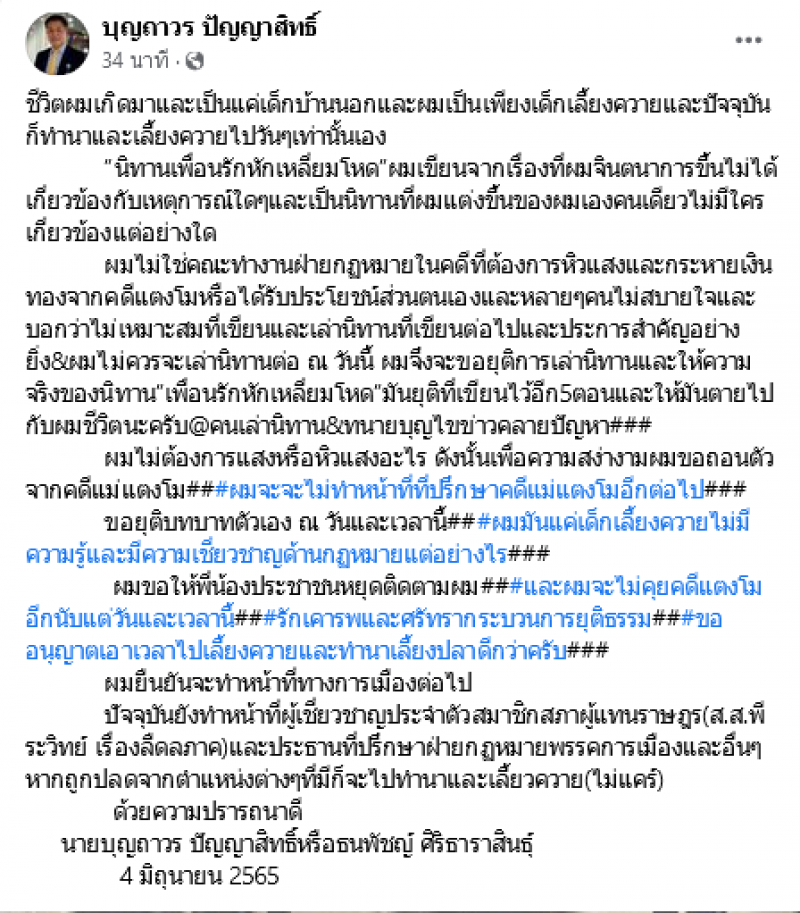 ขอยุติบทบาทตัวเอง ณ วันและเวลานี้###ผมมันแค่เด็กเลี้ยงควายไม่มีความรู้และมีความเชี่ยวชาญด้านกฏหมายแต่อย่างไร###