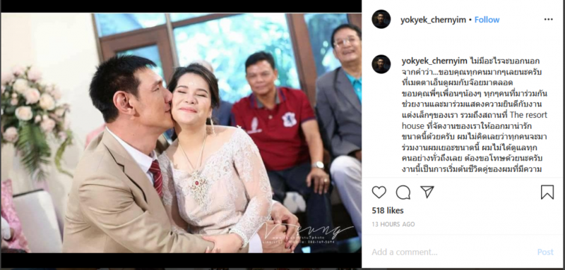 ล่าสุด โยกเยก ได้ดพสต์เผยความรู้สึกผ่านอินสตาแกรมส่วนตัวระบุว่า ไม่มีอะไรจะบอกนอกจากคำว่า ขอบคุณทุกคนมากๆเลยนะครับ ที่เมตตาเอ็นดูผมกับจ๊อยมาตลอด ขอบคุณพี่ๆเพื่อนๆน้องๆ ทุกๆคนที่มาร่วมกันช่วยงานและมาร่วมแสดงความยินดีกับงานแต่งเล็กๆของเรา รวมถึงสถานที่ The resort house ที่จัดงานของเราให้ออกมาน่ารักขนาดนี้ด้วยครับ ผมไม่คิดเลยว่าทุกคนจะมาร่วมงานผมเยอะขนาดนี้ ผมไม่ได้ดูแลทุกคนอย่างทั่วถึงเลย ต้องขอโทษด้วยนะครับ งานนี้เป็นการเริ่มต้นชีวิตคู่ของผมที่มีความสุขที่สุด ขอบคุณทุกคนจากใจจริงครับ