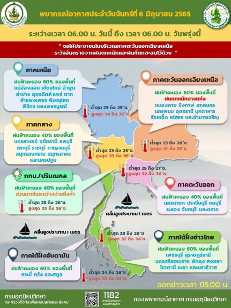 วันที่ 6 มิ.ย.2565 กรมอุตุฯ พยากรณ์อากาศ 24 ชั่วโมงข้างหน้า มรสุมตะวันตกเฉียงใต้กำลังปานกลางพัดปกคลุมทะเลอันดามัน ประเทศไทย และอ่าวไทย ในขณะที่มีหย่อมความกดอากาศต่ำปกคลุมประเทศเวียดนามตอนบนและอ่าวตังเกี๋ย