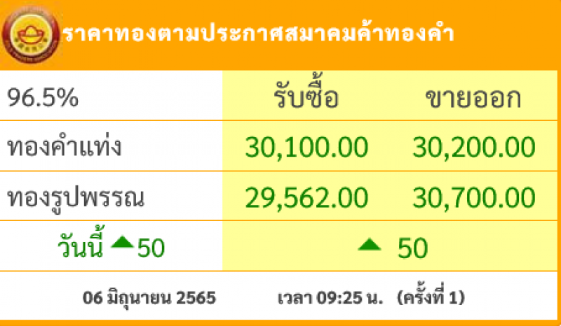 วันที่ 6 มิถุนายน 2565 สมาคมค้าทองคำรายงาน ราคาทองไทย ครั้งที่ 1 เมื่อเวลา 09:25 น. โดยราคาทองล่าสุดราคานั้น ได้มีการปรับขึ้นมาอีก 50 บาท ในวันนี้ ส่งผลทำให้ราคาวันนี้ทองคำ แท่ง รับซื้อบาทละ 30,100 ขายออกบาทละ 30,200 บาท ส่วนทองรูปพรรณ รับซื้อบาทละ 29,562 ขายออกบาทละ 30,700 บาท