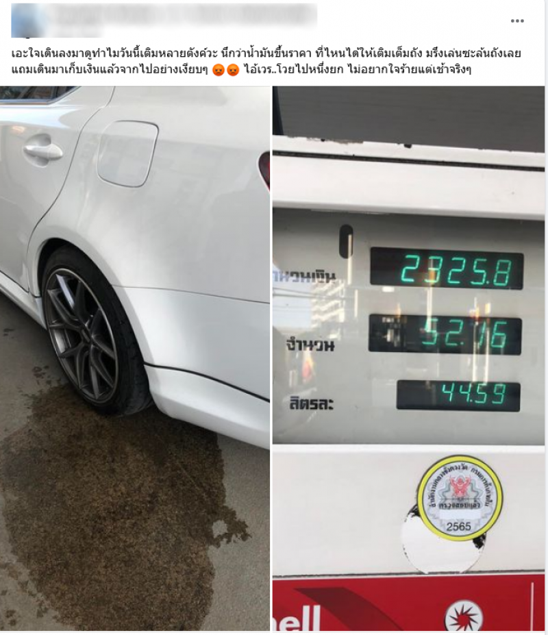 วันที่ 6 มิ.ย. 65 ผู้ใช้เฟซบุ๊กรายหนึ่ง ได้มีการโพสต์เรื่องราวเตือนเป็นอุทาหรณ์ หลังจากที่เธอต้องพบกับเหตุการณ์ไม่คาดคิด เมื่อเธอขับรถเข้าปั๊มน้ำมันแห่งหนึ่ง และสั่งเติมน้ำมันเต็มถังตามปกติ แต่รู้สึกเอะใจที่ราคาน้ำมันที่ต้องจ่ายแพงกว่าที่เติมเต็มถังปกติ พอเปิดประตูออกมาดูเท่านั้นถึงรู้ว่าเด็กปั๊มเติมน้ำมันให้จนล้นออกมานอกถังน้ำมัน น้ำมันหกเลอะพื้น รวมถึงเลอะสีรถขึ้นเป็นคราบ