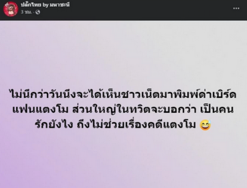 ล่าสุด เบิร์ด ได้โพสต์ภาพ ขณะกำลังอยู่ท่าเรือ ซึ่งในภาพนั้นระบุเวลา 03.00 น. ในขณะที่ เพจดัง ปลั๊กไทย by มหาชะนี ได้ออกมาระบุว่า ไม่นึกว่าวันหนึ่งจะได้เห็นชาวเน็ต มาพิมพ์ด่า เบิร์ด แฟนแตงโม ส่วนใหญ่ในทวิตจะบอกว่า เป็นคนรักยังไง ถึงไม่ช่วยเรื่องคดีแตงโม ทำเอาแฟนเพจแห่คอมเมนต์กันสนั่น