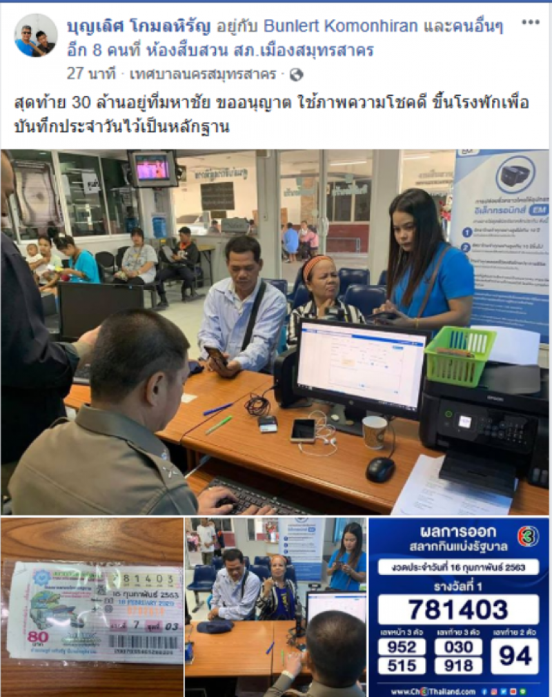 เรียกได้ว่าเมื่อวานนี้หลังประกาศผลรางวัลสลากกินแบ่งรัฐบาลกันไปเป็นที่เรียบร้อย เราก็จะเห็นเศรษฐีหน้าใหม่กันไปหลายท่านแล้ว ล่าสุด ที่หลายท่านยังไม่รู้มีอีกรายโผล่ที่มาหาชัย ล่าสุดเมื่อวันที่ 17 ผู้ใช้เฟสบุ๊ครายหนึ่งชื่อว่า บุญเลิศ โกมลหิรัญ ได้โพสต์ข้อความระบุว่า สุดท้าย 30 ล้านอยู่ที่มหาชัย ขออนุญาต ใช้ภาพความโชคดี ขึ้นโรงพักเพื่อบันทึกประจำวันไว้เป็นหลักฐาน