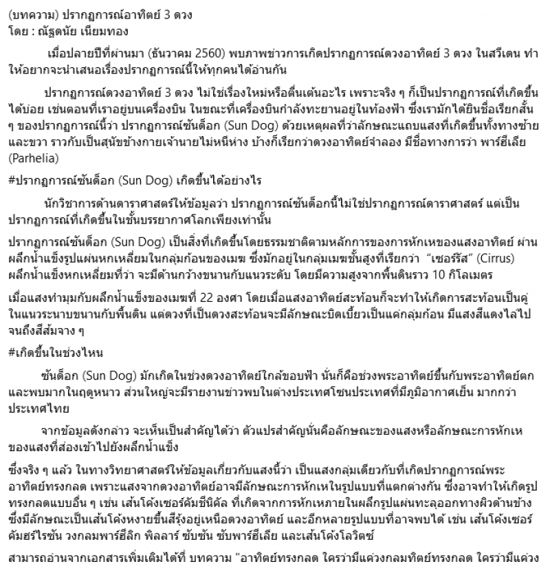 ล่าสุดทางด้านอาจารย์เจษฎ์ ก็ได้มีการออกมาให้ข้อมูลว่า อันนี้เรียก ปรากฏการณ์ Sun Dog หรือ สุนัขของพระอาทิตย์ ครับ ... เป็นปราฏการณ์ธรรมชาติที่เห็นได้เรื่อยๆ ในวันที่เมฆชนิดที่มีเกล็ดน้ำแข็งปะปนอยู่เยอะ จึงทำให้แสงอาทิตย์สะท้อนเป็นวงกลม เหมือนพระอาทิตย์ทรงกลด พระจันทร์ทรงกลด ครับ