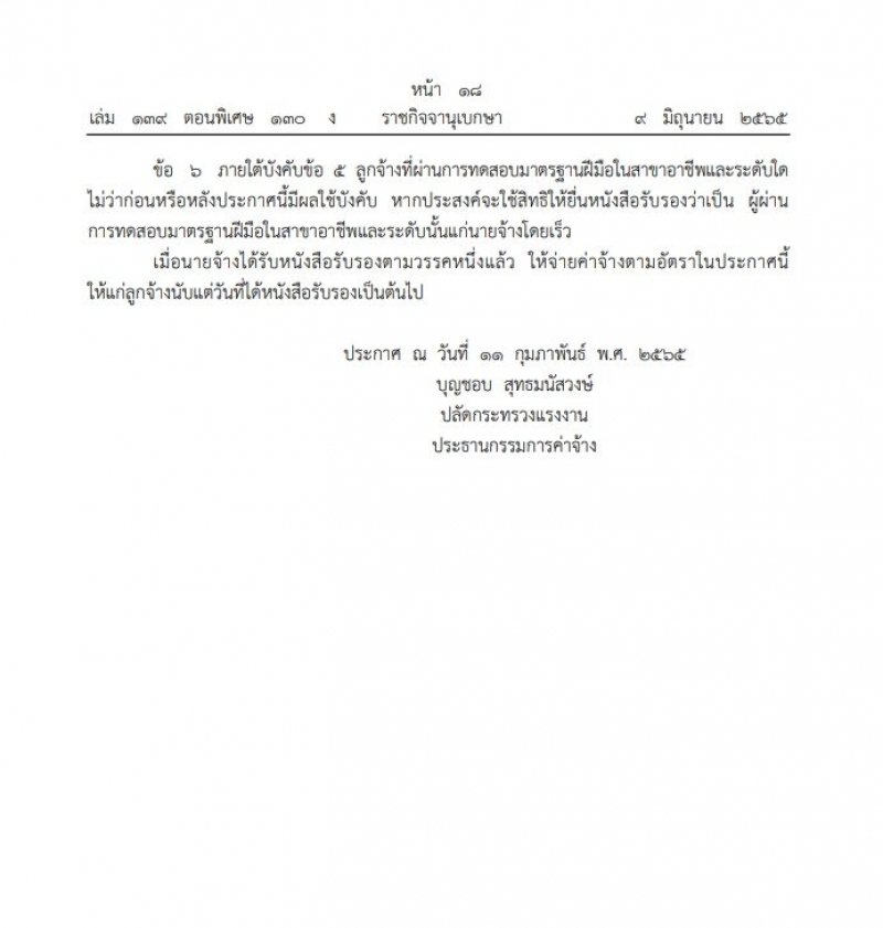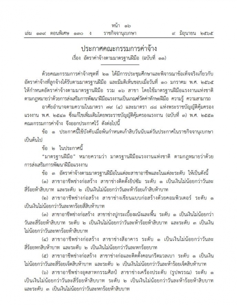 เมื่อวันที่ 10 มิถุนายน 2565 ที่ผ่านมา มีรายงานว่า เว็บไซต์ราชกิจจานุเบกษา เผยแพร่ประกาศคณะกรรมการค่าจ้างเรื่อง อัตราค่าจ้างตามมาตรฐานฝีมือ (ฉบับที่ 11) ลงวันที่ 9 มิถุนายน 2565 ระบุในประกาศว่า