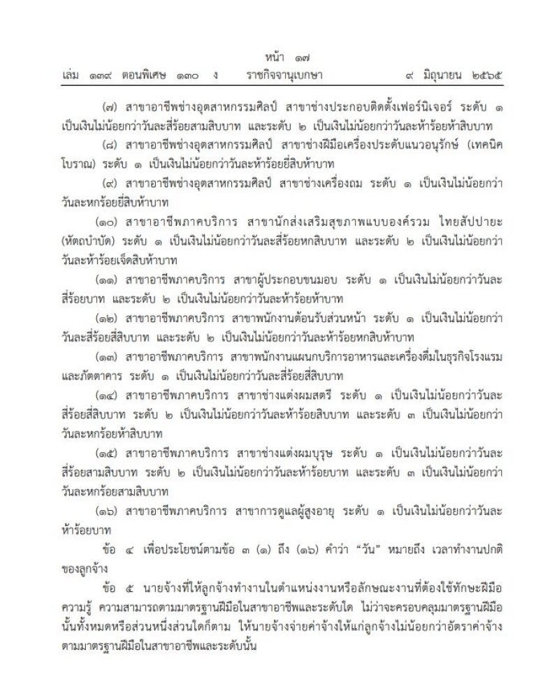 (16) สาขาอาชีพภาคบริการ สาขาการดูแลผู้สูงอายุ ระดับ 1 เป็นเงินไม่น้อยกว่าวันละห้าร้อยบาท
