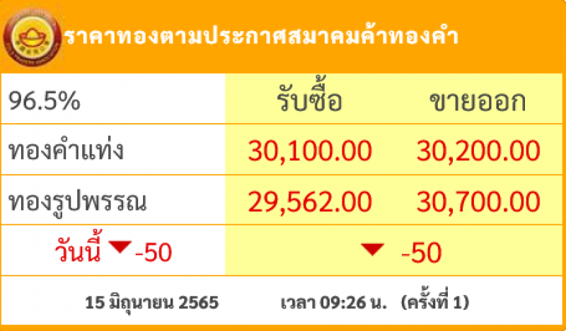 วันที่ 15 มิถุนายน 2565 สมาคมค้าทองคำรายงาน ราคาทองไทย ครั้งที่ 1 เมื่อเวลา 09:26 น. โดยราคาทองล่าสุดราคานั้น ได้มีการปรับลงมา 50 บาท ในวันนี้ ส่งผลทำให้ราคาวันนี้ทองคำ แท่ง รับซื้อบาทละ 30,100 ขายออกบาทละ 30,200 บาท ส่วนทองรูปพรรณ รับซื้อบาทละ 29,562 ขายออกบาทละ 30,700 บาท
