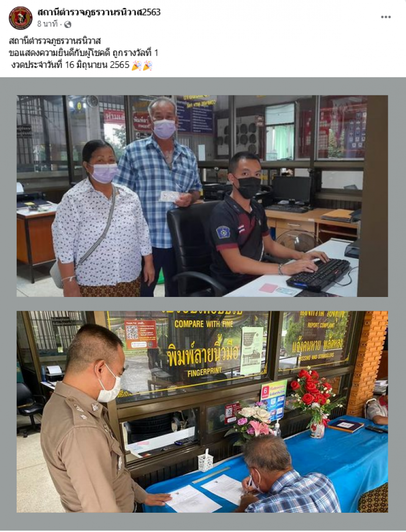 ล่าสุดมีรายงานว่าในใช้เฟซบุ๊กเพจ สถานีตำรวจภูธรวานรนิวาส2563 ได้มีการโพสต์ภาพผู้ถูกรางวัลที่ 1 หมายเลข 361807 โดยระบุว่า สถานีตำรวจภูธรวานรนิวาส ขอแสดงความยินดีกับผู้โชคดี ถูกรางวัลที่ 1 งวดประจำวันที่ 16 มิถุนายน 2565