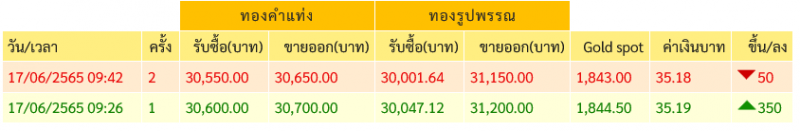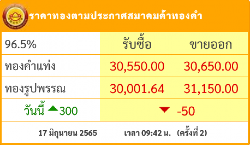 วันที่ 17 มิถุนายน 2565 สมาคมค้าทองคำรายงาน ราคาทองไทย โดยราคาทองล่าสุดราคานั้น ราคาค่อนข้างผันผวน มีการปรับขึ้นลง ส่งผลให้ราคาทองวันนี้ ทองคำ แท่ง รับซื้อบาทละ 30,550 ขายออกบาทละ 30,650 บาท ส่วนทองรูปพรรณ รับซื้อบาทละ 30,001.64 ขายออกบาทละ 31,150 บาท