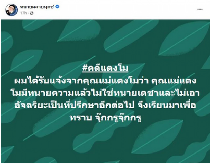 ที่สำคัญ ทนายเดชา เผยความจริงล่าสุด เเม่เเตง ได้ทนายความคนใหม่แล้ว คือ นายชนบท ศุภศรี ซึ่งเป็นทนายความที่อาวุโสพร้อมกับมีประสบการณ์ โดยเหตุผลที่เลือกทนายคนดังกล่าวนั้น เนื่องจากเป็นทนายความจริง