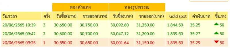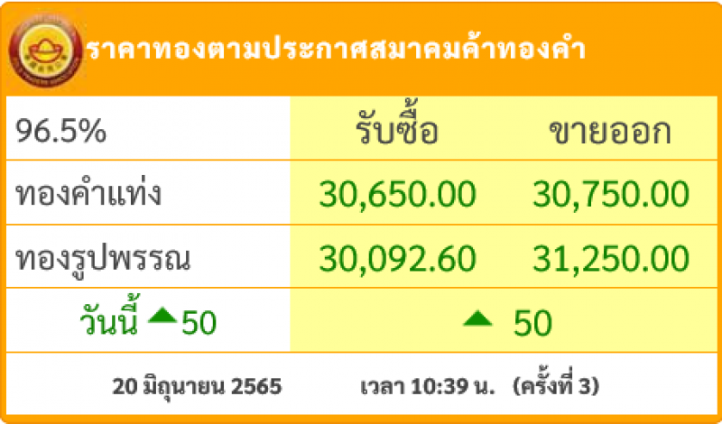 วันที่ 20 มิถุนายน 2565 สมาคมค้าทองคำรายงาน ราคาทองไทย โดยราคาทองล่าสุดราคานั้น ราคาค่อนข้างผันผวน มีการปรับขึ้นลง ส่งผลให้ราคาทองวันนี้ ทองคำ แท่ง รับซื้อบาทละ 30,650 ขายออกบาทละ 30,750 บาท ส่วนทองรูปพรรณ รับซื้อบาทละ 30,092.60 ขายออกบาทละ 31,250 บาท