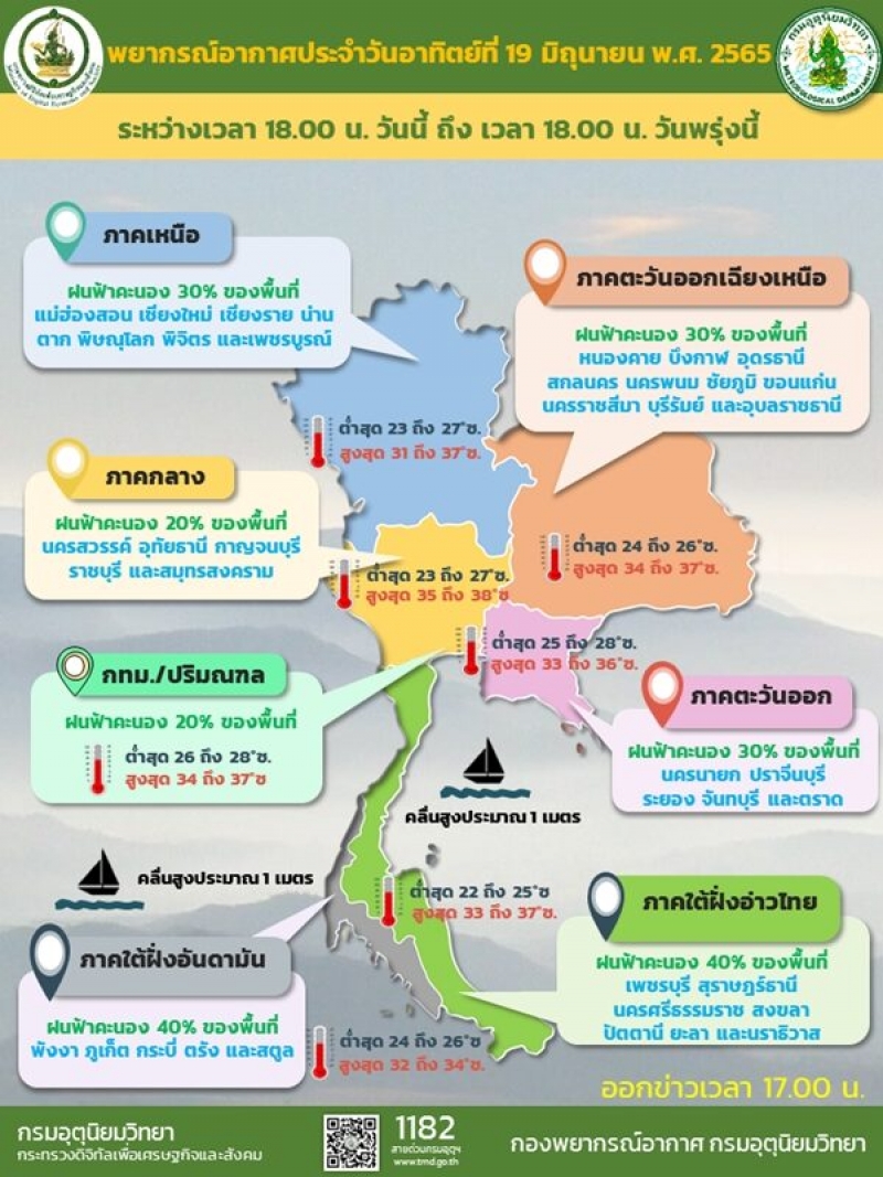 วันที่ 20 มิ.ย.2565 กรมอุตุฯ พยากรณ์อากาศ 24 ชั่วโมงข้างหน้า ประเทศไทยมีฝนลดน้อยลง แต่ยังคงมีฝนฟ้าคะนองเกิดขึ้นได้บางพื้นที่ ส่วนมากบริเวณด้านรับมรสุมตะวันตกเฉียงใต้ ขอให้ประชาชนระมัดระวังอันตรายจากการสัญจรผ่านบริเวณที่มีฝนไว้ด้วย