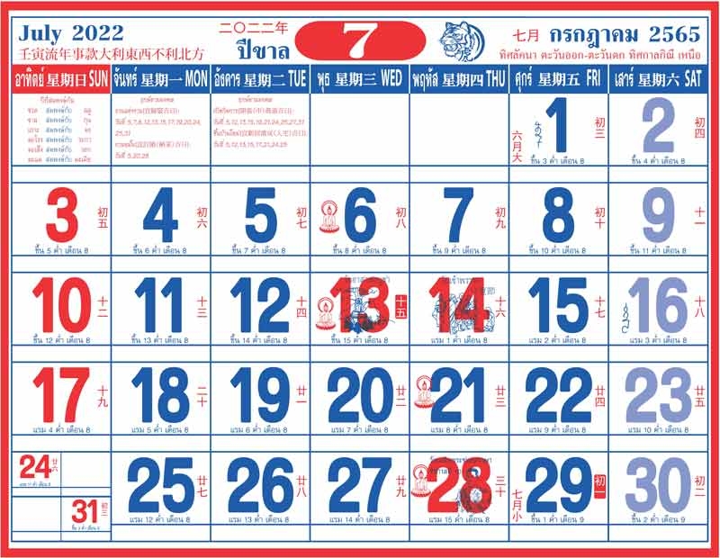 วันพุธที่ 13 ก.ค.65 เป็นวันอาสาฬหบูชา ต่อมาวันพฤหัสบดีที่ 14 ก.ค.65 เป็นวันเข้าพรรษา ส่วนช่วงปลายเดือนวันพฤหัสบดีที่ 28 ก.ค.65 เป็นวันเฉลิมพระชนมพรรษา พระบาทสมเด็จพระปรเมนทรรามาธิบดีศรีสินทรมหาวชิราลงกรณ พระวชิรเกล้าเจ้าอยู่หัว