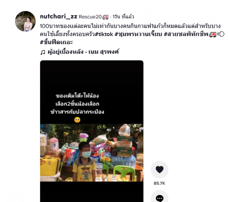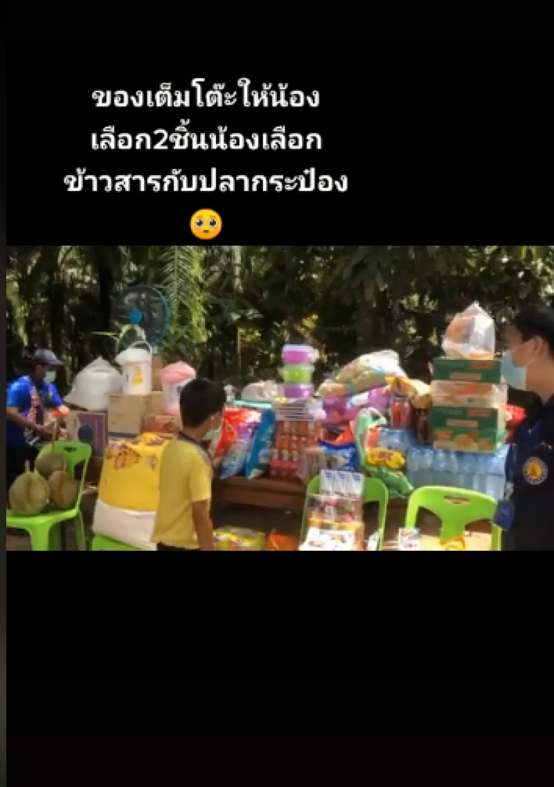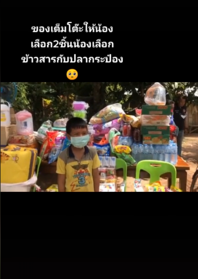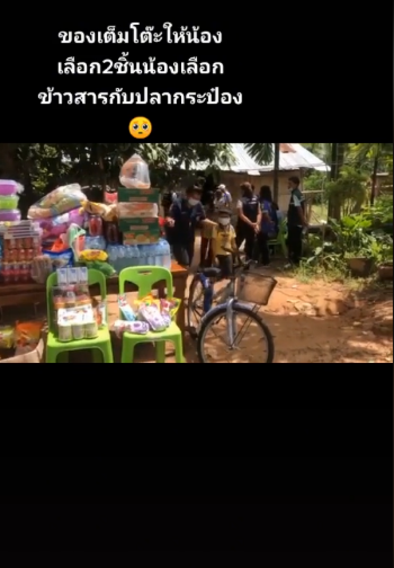 เรียกได้ว่าเป็นเรื่องที่ชาวโซเชียลต่างเข้ามาแสดงความคิดเห็นกันเป็นจำนวนมาก หลังได้มีผู้ใหญ่ใจดีเอาของไปให้น้องที่ลำบาก ซึ่งก็มีทั้งข้าวสารอาหารแห้ง จักรยาน ทุเรียนของใช้มากมาย ซึ่งได้เอามาอบให้น้องทั้งหมด แต่แกล้งให้น้องเลือกแค่ 2 อย่าง ซึ่งพอให้น้องเลือกหยิบ น้องก็เลือกหยิบแค่ข้าวสารกับปลากระป๋อง ทำหลายคนถึงกับน้ำตาซึม เพราะเด็กคนอื่นคงเลือกจักรยานแน่ๆ โดยเจ้าของโพสต์ได้ระบุข้อความว่า 100บาทของเเต่ละคนไม่เท่ากันบางคนกินกาแฟ1แก้วก็หมดแล้วแต่สำหรับบางคนใช้เลี้ยงทั้งครอบครัว