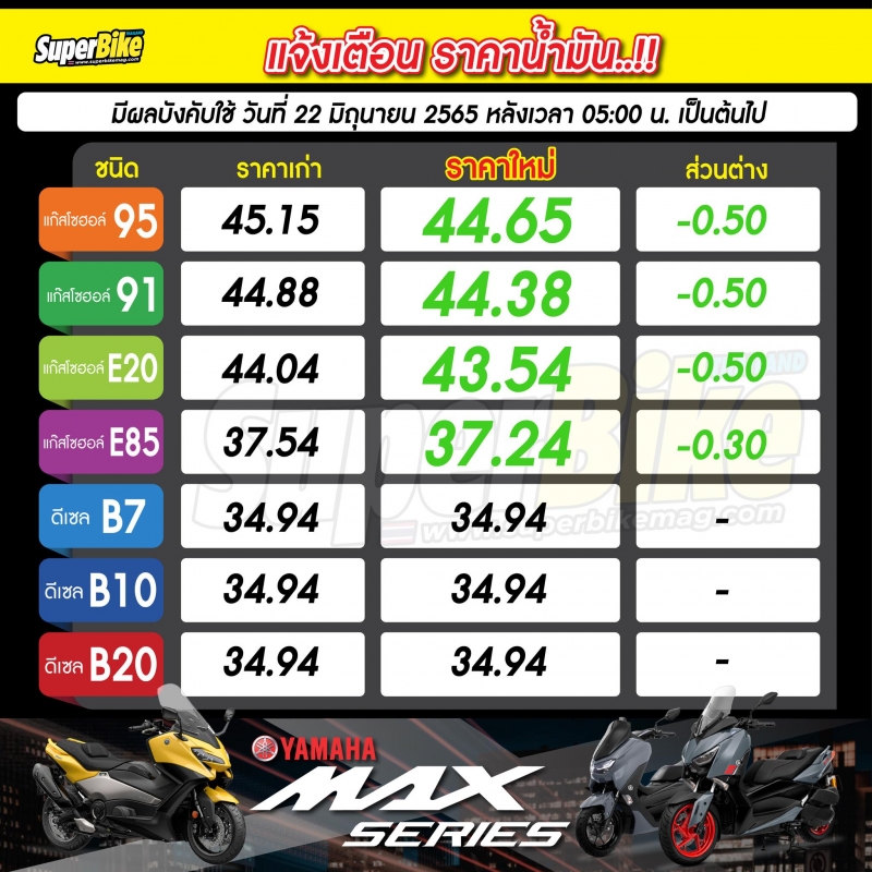 เมื่อวันที่ 21 มิถุนายน 2565 ในเฟซบุ๊กเพจ Superbike Magazine (Thailand's Edition) Fan Page ได้มีการแจ้งราคาน้ำมัน จะมีการปรับขึ้นพรุ่งนี้ โดยจะมีการปรับขึ้นราคากลุ่มน้ำมัน เบนซินลด 50 สตางค์ ยกเว้น E85 ลด 30 สตางค์ มีผลบังคับใช้ 22/6/2565 เวลา 5.00 น.