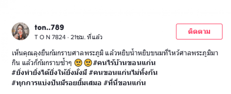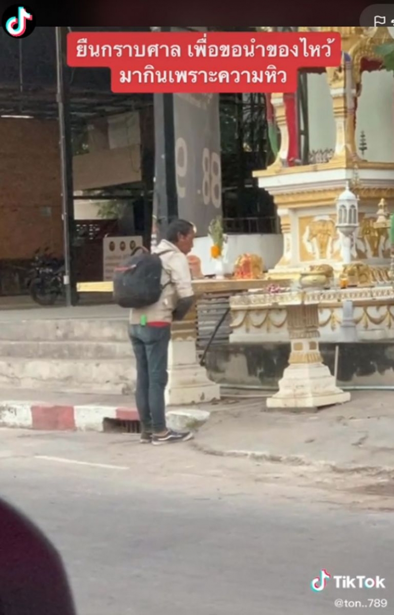 เรียกได้ว่าเป็นอีกหนึ่งคลิป ที่ทำเอาหลายคนอดเห็นใจไม่ได้ หลังจากที่มีผู้ใช้ tiktok ชื่อ ton..789 ได้ลงเรื่องราว เห็นคุณลุงท่านนี้กำลังยืนก้มกราบศาลพระภูมิซ้ำๆ แล้วหยิบน้ำ หยิบขนมที่ไหว้ศาลพระภูมิมากิน แล้วก็ก้มกราบซ้ำๆ หลังจากที่เธอเห็นภาพนี้ต่อหน้า เธอจึงรีบเรียกคุณลุงคนนี้พร้อมยื่นเงินจำนวนหนึ่งให้เพื่อให้คุณลุงไปซื้อข้าวกิน