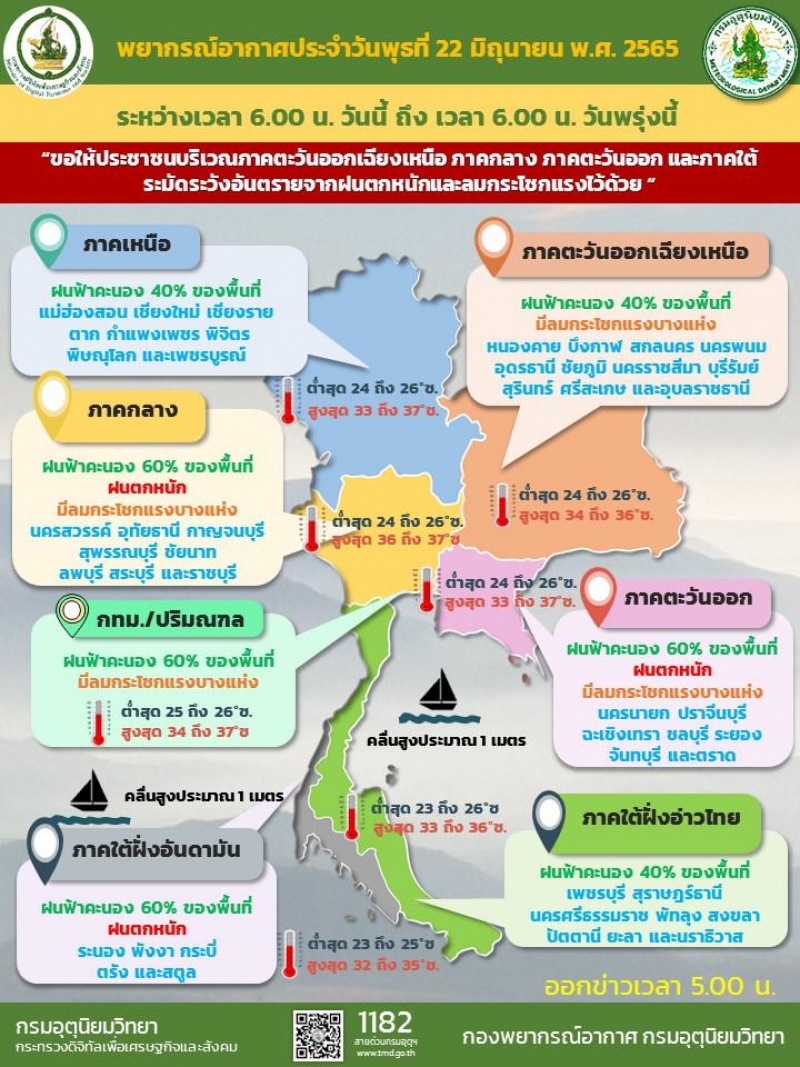 วันที่ 22 มิถุนายน 2565 กรมอุตุฯ พยากรณ์อากาศ 24 ชั่วโมงข้างหน้า มรสุมตะวันตกเฉียงใต้พัดปกคลุมทะเลอันดามัน ประเทศไทย และอ่าวไทย ประกอบกับมีหย่อมความกดอากาศต่ำบริเวณประเทศเวียดนามตอนบน ทำให้ประเทศไทยมีฝนฟ้าคะนองเกิดขึ้นได้บางพื้นที่ และมีฝนตกหนักกับมีลมกระโชกแรงบางแห่ง บริเวณภาคตะวันออกเฉียงเหนือ ภาคกลาง ภาคตะวันออก และภาคใต้ ขอให้ประชาชนระมัดระวังอันตรายจากฝนตกหนักและลมกระโชกแรงไว้ด้วย