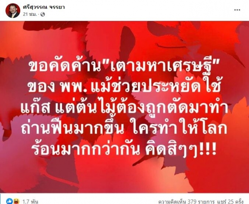 ล่าสุด นายศรีสุวรรณ จรรยา เลขาธิการสมาคมองค์การพิทักษ์รัฐธรรมนูญไทย โพสต์ข้อความผ่านเฟซบุ๊ก ศรีสุวรรณ จรรยา ถึงกรณีดังกล่าว โดยระบุว่า ขอคัดค้าน เตามหาเศรษฐี ของพพ.แม้ช่วยประหยัดใช้แก๊ส แต่ต้นไม้ต้องถูกตัดมาทำถ่านฟืนมากขึ้น ใครทำให้โลกร้อนมากกว่ากัน คิดสิๆๆ