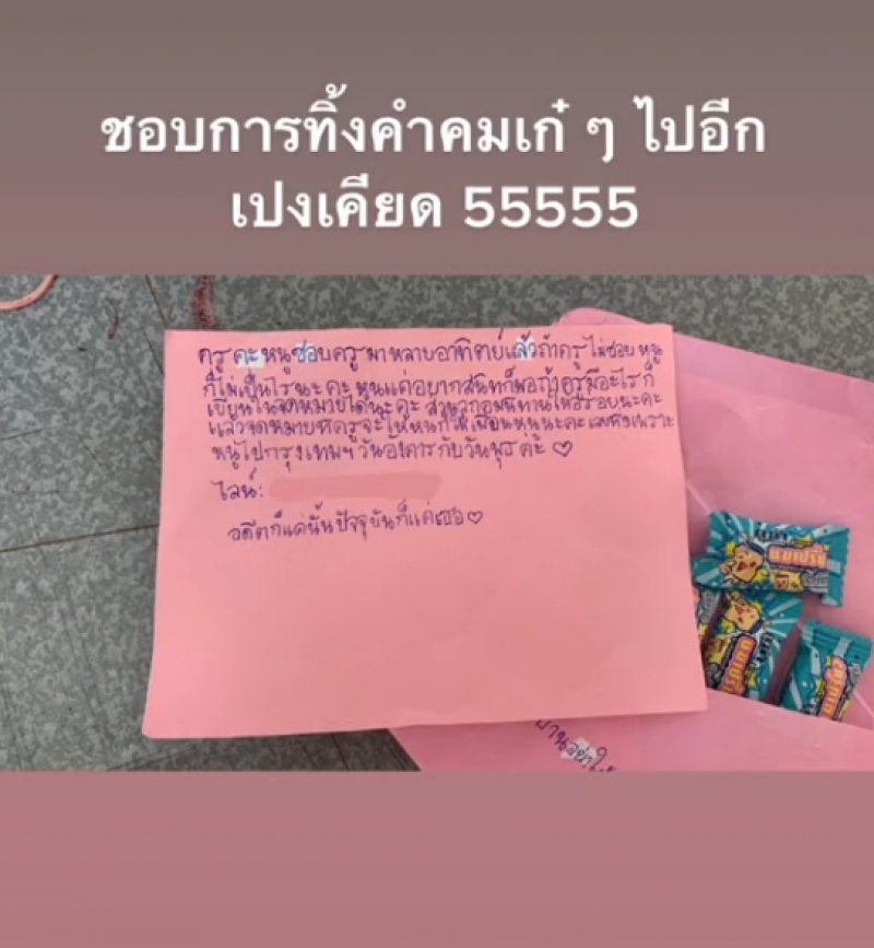 โดยในคลิปจะเห็นซองจดหมายสีชมพู เขียนหน้าซองว่า คำขอร้อง (อ่านที่บ้านอย่าให้ใครรู้ได้ไหมคะ) ส่วนข้อความข้างในเขียนว่า "ครูคะหนูชอบครูมาหลายอาทิตย์แล้ว ถ้าครูไม่ชอบหนูก็เป็นไรนะคะ หนูแค่อยากสนิทก็พอ ถ้าครูมีอะไรก็เขียนในจดหมายได้นะคะ ส่วนลูกอมทานให้อร่อยนะคะ หนูไปกรุงเทพฯ วันอังคารกับวันพุธค่ะ ก่อนจะทิ้งคำคมตอนท้ายว่า "อดีตก็แค่นั้น ปัจจุบันก็แค่เธอ"