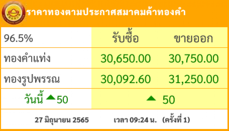 วันที่ 27 มิถุนายน 2565 สมาคมค้าทองคำรายงาน ราคาทองไทย ครั้งที่ 1 เมื่อเวลา 09:24 น. โดยราคาทองล่าสุดราคานั้น ได้มีการปรับขึ้นมาอีก 50 บาทในวันนี้ ส่งผลทำให้ราคาวันนี้ทองคำ แท่ง รับซื้อบาทละ 30,650 ขายออกบาทละ 30,750 บาท ส่วนทองรูปพรรณ รับซื้อบาทละ 30,092.60 ขายออกบาทละ 31,250 บาท