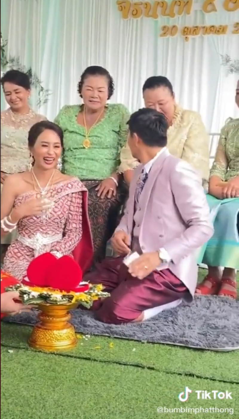 เมื่อไม่กี่วันที่ผ่านทางด้านผู้ใช้ TikTok รายหนึ่ง ได้เผยคลิปพิธีแต่งงานของบ่าวสาวคู่หนึ่งที่กำลังทำพิธีสวมแหวนให้กันและกัน ซึ่งปกติแล้วช่วงที่สวมแหวนเสร็จฝ่ายหญิงจะต้องยกมือไหว้ฝ่ายก่อน แล้วฝ่ายชายก็ต้องรับไหว้ แต่คราวนี้ ฝ่ายเจ้าบ่าวก็ดันยกมือไหว้พร้อมพูด ขอบคุณครับ ขึ้นมาเฉย ทำเอาเจ้าสาวนั้นอดขำไม่ไหว เรียกได้ว่าทำเอาชาวเน็ตเข้ามาแซวสนั่นบอกรู้เลยว่าอยู่บ้านต้องเป็นคนกลัวแฟน บางคนก็บอกว่าให้เกียรติผู้หญิงมาก ๆ ให้ความเท่าเทียมกันมาก ไหว้ก่อนผู้หญิงจะกราบนั้นเอง