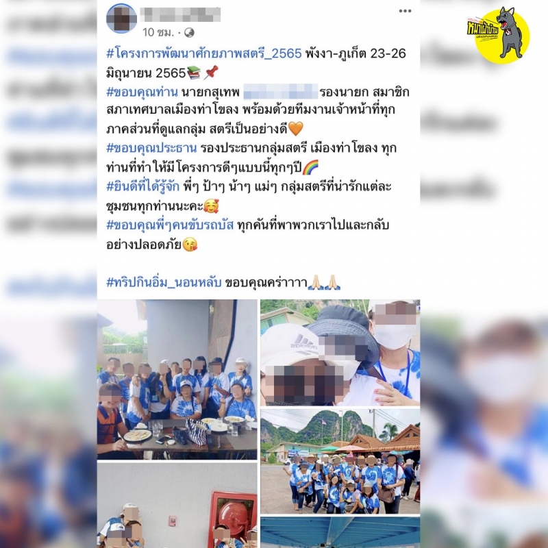 เมื่อวันที่ 27 มิถุนายนที่ผ่านมา ในเฟซบุ๊กเพจ ปฏิบัติการหมาเฝ้าบ้าน ได้มีการเผยภาพกลุ่ม ขรก.จัดทริปเที่ยวทะเล โดยระบุว่า มาทะเลไม่หนีร้อนก็หนีรัก ส่วนเราหนีงาน เทศบาลเมืองท่าโขลง จ.ปทุมธานี จัดกิจกรรมดี ๆ ที่มีให้กับความรัก จัดทริปพัฒนาศักยภาพสตรี เยือนพังงา-ภูเก็ต 3 วัน 4 คืน จ้างเหมารถบัส 7 คัน ใช้งบเฉพาะค่ารถ 490,000 บาท เมื่อวันที่ 23-26 มิถุนายนที่ผ่านมา