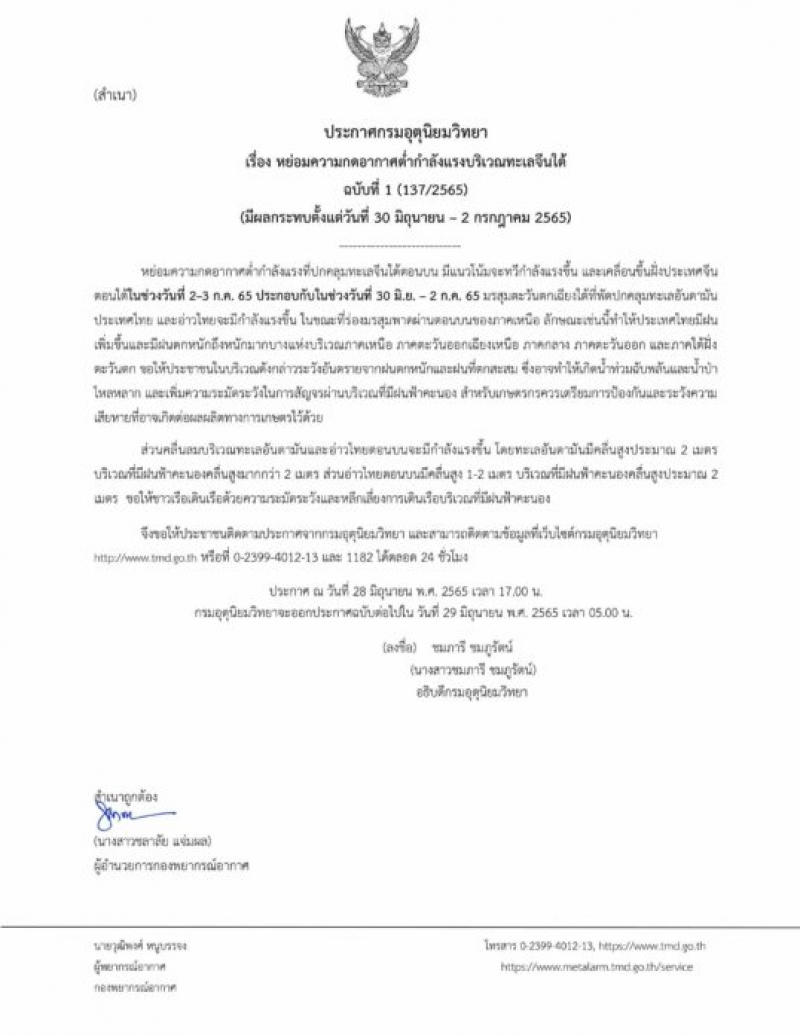 เมื่อเวลา 17.00 น. วันที่ 28 มิ.ย.65 น.ส.ชมภารี ชมภูรัตน์ อธิบดีกรมอุตุฯ ออกประกาศกรมอุตุฯ เรื่อง หย่อมความกดอากาศต่ำกำลังแรงบริเวณทะเลจีนใต้ (มีผลกระทบตั้งแต่วันที่ 30 มิ.ย.-2 ก.ค.65) ฉบับที่ 1 ลงวันที่ 28 มิ.ย.65 ระบุว่า