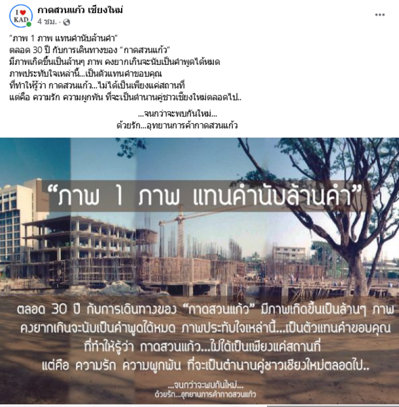 โดยทางเพจได้พิมพ์ข้อความว่า ภาพ 1 ภาพ แทนคำนับล้านคำ ตลอด 30 ปี กับการเดินทางของ กาดสวนแก้ว มีภาพเกิดขึ้นเป็นล้านๆ ภาพ คงยากเกินจะนับเป็นคำพูดได้หมด ภาพประทับใจเหล่านี้…เป็นตัวแทนคำขอบคุณ ที่ทำให้รู้ว่า กาดสวนแก้ว…ไม่ได้เป็นเพียงแค่สถานที่ แต่คือ ความรัก ความผูกพัน ที่จะเป็นตำนานคู่ชาวเชียงใหม่ตลอดไป..จนกว่าจะพบกันใหม่…ด้วยรัก…อุทยานการค้ากาดสวนแก้ว