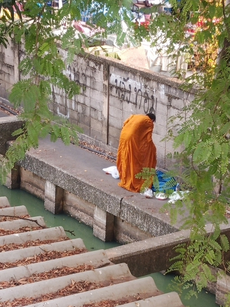 พระสงฆ์ยืนลับๆล่อๆอยู่ข้างกำแพง