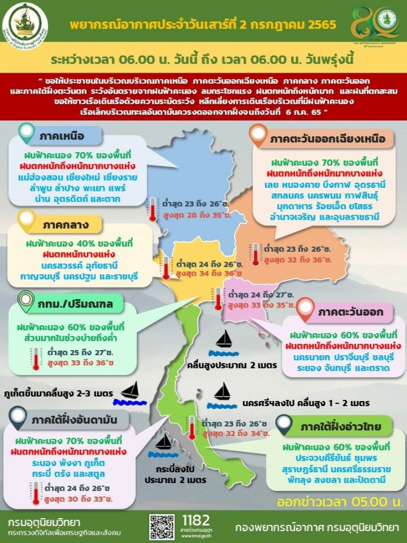 เมื่อวันที่ 2 ก.ค.65 กรมอุตุฯ พยากรณ์อากาศ 24 ชั่วโมงข้างหน้า ร่องมรสุมพาดผ่านประเทศเมียนมา ภาคเหนือตอนบน เข้าสู่หย่อมความกดอากาศต่ำบริเวณประเทศลาว ประกอบกับมรสุมตะวันตกเฉียงใต้ที่พัดปกคลุมทะเลอันดามัน ประเทศไทย และอ่าวไทยมีกำลังค่อนข้างแรง ทำให้ประเทศไทยมีฝนเพิ่มขึ้นกับมีลมกระโชกแรงบางแห่ง