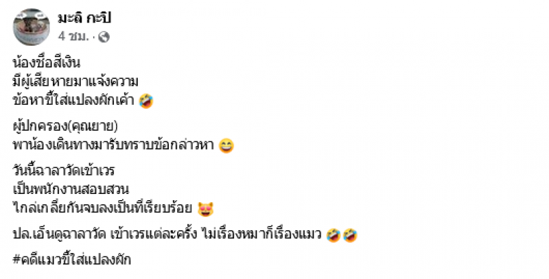 โดยโพสต์ดังกล่าวระบุว่า น้องชื่อสีเงิน มีผู้เสียหายมาแจ้งความ ข้อหาอึใส่แปลงผักเค้า ผู้ปกครอง (คุณยาย) พาน้องเดินทางมารับทราบข้อกล่าวหา วันนี้ฉาลาวัดเข้าเวรเป็นพนักงานสอบสวน ไกล่เกลี่ยกันจบลงเป็นที่เรียบร้อย ปล.เอ็นดูฉาลาวัด เข้าเวรแต่ละครั้ง ไม่เรื่องหมาก็เรื่องแมว