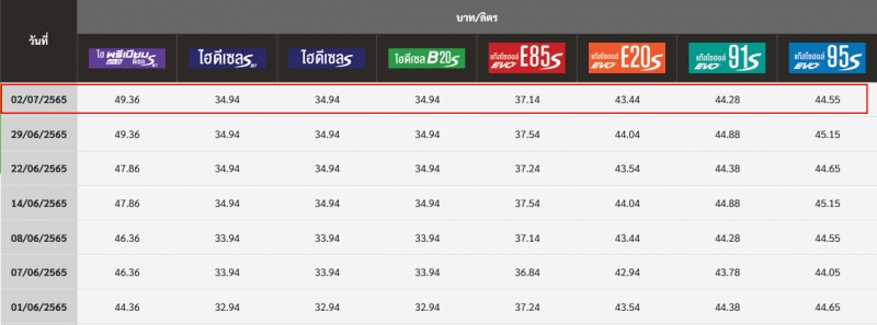วันที่ 2 ก.ค. 2565 ตามข้อมูลจาก ปั๊มน้ำมันบางจาก ซึ่งเมื่อวานนี้ได้มีการแจ้งปรับลดราคาน้ำมันกลุ่มเบนซินลง โดย แก๊สโซฮอล์ 95 จำหน่ายที่ราคาลิตรละ 44.55 บาท ส่วนแก๊สโซฮอล์ 91 จำหน่ายที่ราคาลิตรละ 44.28 บาท ด้านราคาดีเซลวันนี้ ดีเซล B10 จำหน่ายที่ราคา 34.94 บาท ดีเซล B7 ราคา 34.94 บาท และดีเซลพรีเมี่ยม (Hi Premium Diesel S B7) อยู่ที่ 49.36 บาท ส่วนราคาน้ำมันวันพรุ่งนี้ ยังไม่มีประกาศเปลี่ยนแปลง ตามข้อมูลล่าสุดเมื่อเวลา 08.17 น.ที่ผ่านมา