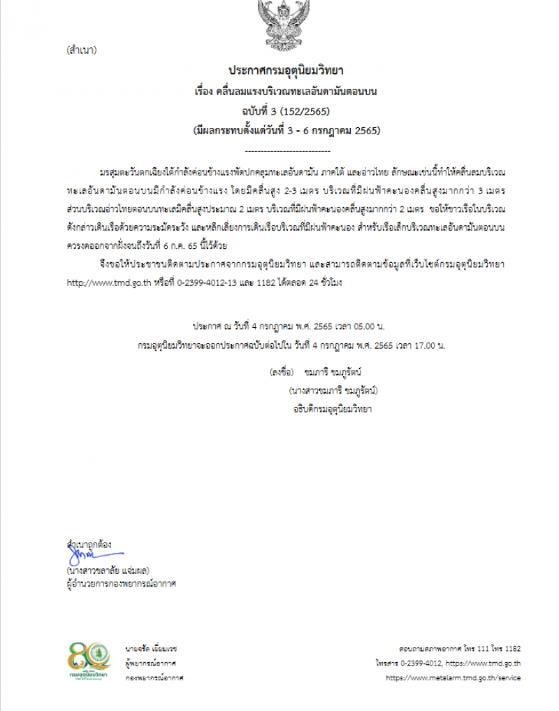 กรมอุตุฯ ประกาศฉบับที่ 3 ลงวันที่ 04 กรกฎาคม 2565 มรสุมตะวันตกเฉียงใต้กำลังค่อนข้างแรงพัดปกคลุมทะเลอันดามัน ภาคใต้ และอ่าวไทย ลักษณะเช่นนี้ทำให้คลื่นลมบริเวณทะเลอันดามันตอนบนมีกำลังค่อนข้างแรง โดยมีคลื่นสูง 2-3 เมตร บริเวณที่มีฝนฟ้าคะนองคลื่นสูงมากกว่า 3 เมตร
