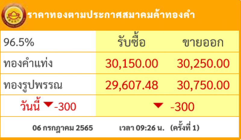 วันที่ 6 กรกฎาคม 2565 สมาคมค้าทองคำรายงาน ราคาทองไทย ครั้งที่ 1 เมื่อเวลา 09:26 น. โดยราคาทองล่าสุดราคานั้นได้มีการปรับลงมา 300 บาท ส่งผลให้ราคาทองวันนี้ ทองคำ แท่ง รับซื้อบาทละ 30,150 ขายออกบาทละ 30,250 บาท ส่วนทองรูปพรรณ รับซื้อบาทละ 29,607.48 ขายออกบาทละ 30,750 บาท