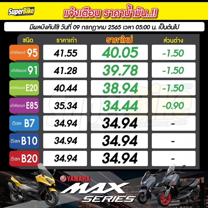 เมื่อวันที่ 8 กรกฎาคม 2565 ในเฟซบุ๊กเพจ Superbike Magazine (Thailand's Edition) Fan Page ได้มีการแจ้งราคาน้ำมัน จะมีการปรับขึ้นพรุ่งนี้ โดยจะมีการปรับลงราคากลุ่มน้ำมันเบนซิน ปรับราคาน้ำมันลง ลดราคาน้ำมัน กลุ่มเบนซิน 1.50 สตางค์ ยกเว้น E85 ลด 90 สตางค์ มีผลบังคับใช้ วันที่ 2 กรกฏาคม 2565 เวลา 5.00 น.