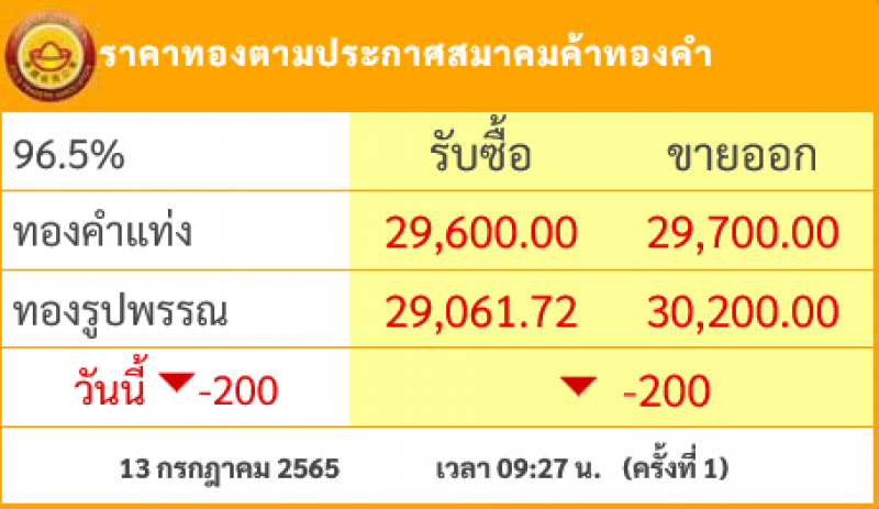 วันที่ 13 กรกฎาคม 2565 สมาคมค้าทองคำรายงาน ราคาทองไทย ครั้งที่ 1 เมื่อเวลา 09:27 น. โดยราคาทองล่าสุดราคานั้นได้มีการปรับลงมาอีก 200 บาท ส่งผลให้ราคาทองวันนี้ ทองคำ แท่ง รับซื้อบาทละ 29,600 ขายออกบาทละ 29,700 บาท ส่วนทองรูปพรรณ รับซื้อบาทละ 29,061.72 ขายออกบาทละ 30,200 บาท