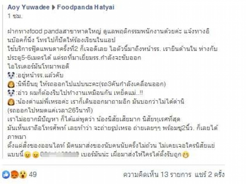 เรียกได้ว่าเป็นเรื่องราวที่มีคนต่างเข้ามาแสดงความคิดเห็นกันเป็นจำนวนมาก โดยเป็นเรื่องราวของสาวรายหนึ่งที่สั่งอาหารผ่านแอฟพลิเคชั่นแล้วเกิดมีปัญหากัน โดยได้ระบุข้อความเอาไว้ว่า ฝากทางfood panda สาขาหาดใหญ่ ดูแลพฤติกรรมพนักงานด้วยค่ะ แจ้งทางอินบ๊อคก็นิ่ง โทรไปก็ปัดให้ร้องเรียนในแอปใช้บริการฟู๊ดแพนดาครั้งที่2 ก็เจอดีเลย เมื่อพนักงานคนนี้มาถึงหน้ารร.เรายืนด้านใน ห่างกับประตู 5-6 เมตรได้ แต่รถที่มาเยี่ยมรร กำลังจะขับออก