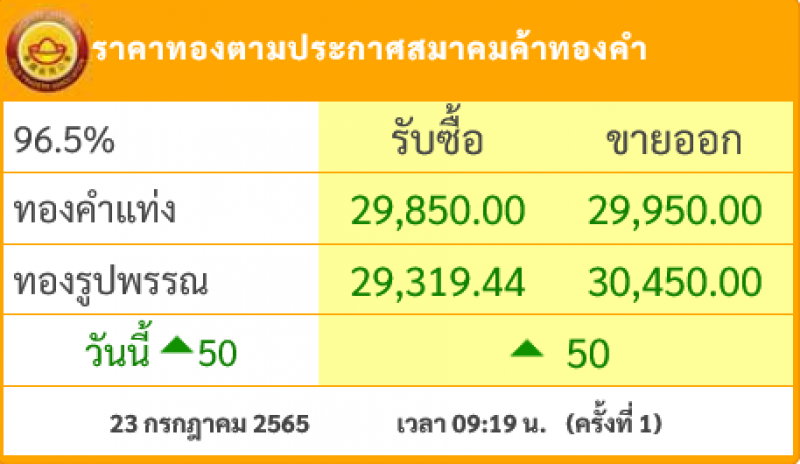 วันที่ 23 กรกฎาคม 2565 สมาคมค้าทองคำรายงาน ราคาทองไทย ครั้งที่ 1 เมื่อเวลา 09:19 น. โดยราคาทองล่าสุดราคานั้นได้มีการปรับขยับขึ้นมา 50 บาท ส่งผลให้ราคาทองวันนี้ ทองคำ แท่ง รับซื้อบาทละ 29,850 ขายออกบาทละ 29,950 บาท ส่วนทองรูปพรรณ รับซื้อบาทละ 29,319.44 ขายออกบาทละ 30,450 บาท