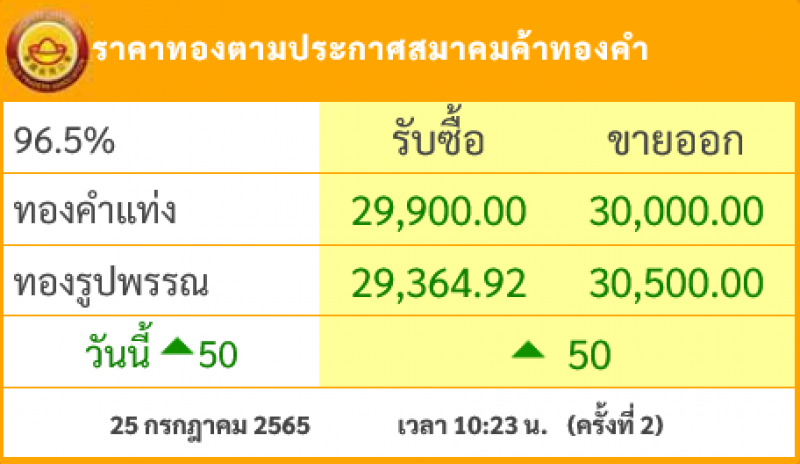 วันที่ 25 กรกฎาคม 2565 สมาคมค้าทองคำรายงาน ราคาทองไทย ครั้งที่ 1 เมื่อเวลา 09:23 น. โดยราคาทองล่าสุดราคานั้นได้มีการปรับขยับขึ้นมา 50 บาท ส่งผลให้ราคาทองวันนี้ ทองคำ แท่ง รับซื้อบาทละ 29,900 ขายออกบาทละ 30,000 บาท ส่วนทองรูปพรรณ รับซื้อบาทละ 29,364.92 ขายออกบาทละ 30,500 บาท