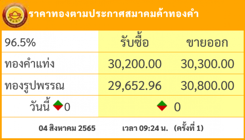 วันที่ 4 สิงหาคม 2565 สมาคมค้าทองคำรายงาน ราคาทองไทย ราคาทองไทย ครั้งที่ 1 เมื่อเวลา 09:24 น. โดยราคาทองล่าสุดราคานั้น ยังคงที่นับจากเมื่อวานนี้ที่ขยับขึ้น ส่งผลให้ราคาทองวันนี้ ทองคำ แท่ง รับซื้อบาทละ 30,200 ขายออกบาทละ 30,300 บาท ส่วนทองรูปพรรณ รับซื้อบาทละ 29,652.96 ขายออกบาทละ 30,800 บาท