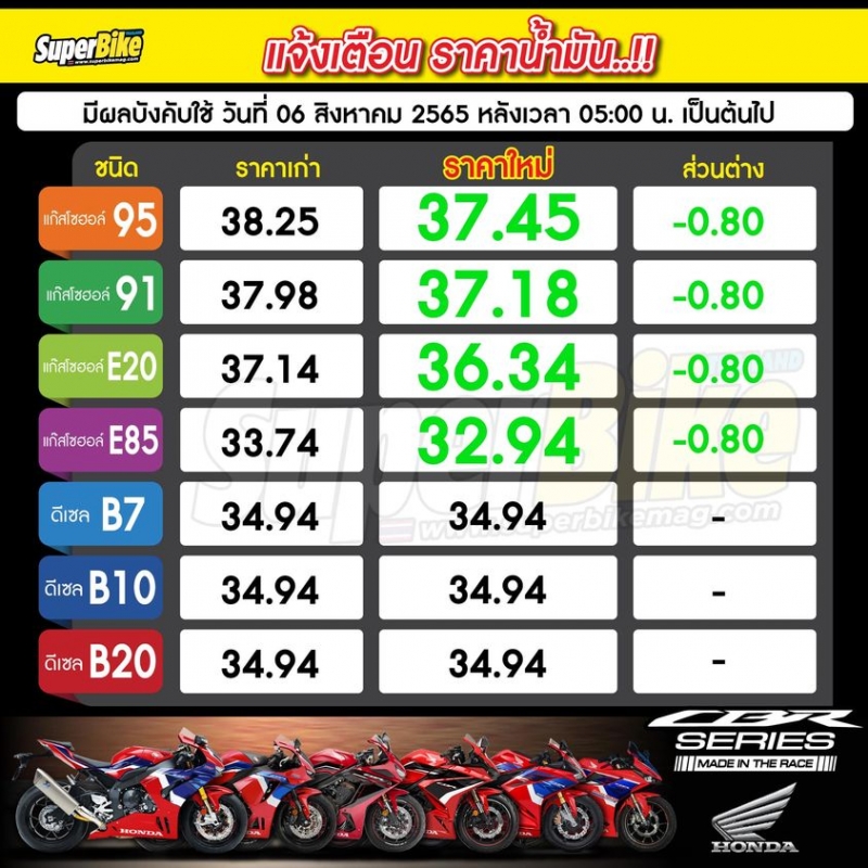 เมื่อวันที่ 5 สิงหาคม 2565 ในเฟซบุ๊กเพจ Superbike Magazine (Thailand's Edition) Fan Page ได้มีการแจ้งราคาน้ำมัน จะมีการปรับลงพรุ่งนี้ โดยจะมีการปรับลดราคากลุ่มน้ำมันเบนซิน ปรับราคาน้ำมันขึ้น ราคาน้ำมัน กลุ่มเบนซิน 80 สตางค์ มีผลบังคับใช้ วันที่ 6 สิงหาคม 2565 2565 เวลา 5.00 น.