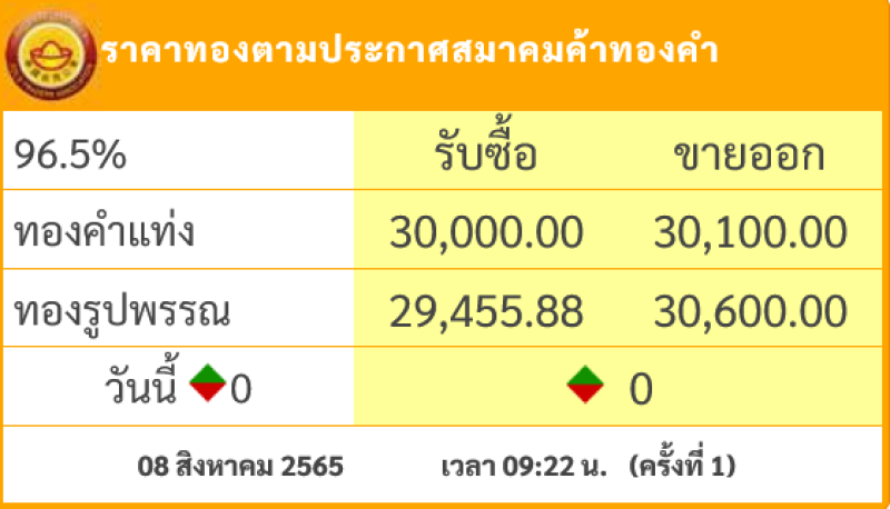 วันที่ 8 สิงหาคม 2565 สมาคมค้าทองคำรายงาน ราคาทองไทย ราคาทองไทย ครั้งที่ 1 เมื่อเวลา 09:22 น. โดยราคาทองล่าสุดราคานั้นยังคงที่ หลังจากที่ได้มีการปรับลดลงมา ส่งผลให้ราคาทองวันนี้ ทองคำ แท่ง รับซื้อบาทละ 30,000 ขายออกบาทละ 30,100 บาท ส่วนทองรูปพรรณ รับซื้อบาทละ 29,455.88 ขายออกบาทละ 30,600 บาท