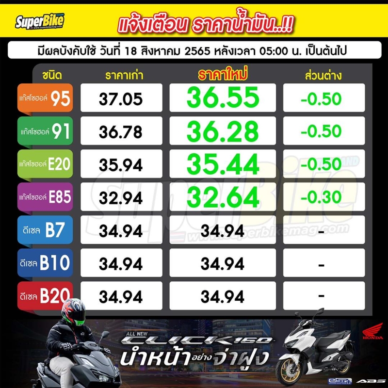 เมื่อวันที่ 18 สิงหาคม 2565 ในเฟซบุ๊กเพจ Superbike Magazine (Thailand's Edition) Fan Page ได้มีการแจ้งราคาน้ำมัน จะมีการปรับลงพรุ่งนี้ โดยจะมีการปรับลดราคากลุ่มน้ำมันเบนซิน กลุ่มน้ำมันเบนซิน ปรับลดราคา 50 สตางค์ ยกเว้น E85 ปรับลดราคา 30 สตางค์ มีผลบังคับใช้ วันที่ 18 สิงหาคม 2565 เวลา 05.00 น.