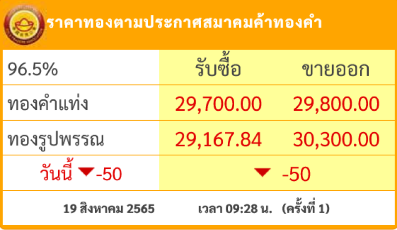 วันที่ 19 สิงหาคม 2565 สมาคมค้าทองคำรายงาน ราคาทองไทย ราคาทองไทย ครั้งที่ 1 เมื่อเวลา 09:28 น. โดยราคาทองล่าสุดราคานั้นได้มีการปรับลดลงมา 50 บาท ส่งผลให้ราคาทองวันนี้ ทองคำ แท่ง รับซื้อบาทละ 29,700 ขายออกบาทละ 29,800 บาท ส่วนทองรูปพรรณ รับซื้อบาทละ 29,167.84 ขายออกบาทละ 30,300 บาท