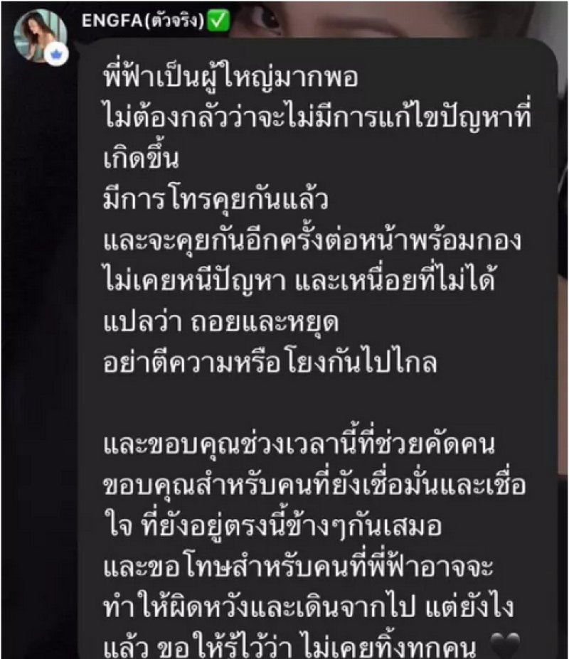 โดยระบุข้อความดังกล่าวว่า พี่ฟ้าเป็นผู้ใหญ่มากพอ ไม่ต้องกลัวว่าจะไม่มีการแก้ไขปัญหาที่เกิดขึ้น มีการโทรคุยกันแล้วและจะคุยกันอีกครั้งต่อหน้าพร้อมกอง ไม่เคยหนีปัญหา และเหนื่อยที่ไม่ได้แปลว่าถอยและหยุด อย่าตีความหรือโยงกันไปไกล