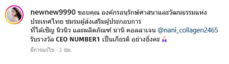 ล่าสุดในอินสตาแกรส่วนตัวของสาว นิวนิว ก็ได้มีการแจ้งข่าวดีให้กับแฟนๆว่าเธอนั้น ได้รับรางวัลอันทรงคุณค่า โดยระบุว่า ขอบคุณ องค์กรอนุรักษ์ศาสนาและวัฒนธรรมแห่งประเทศไทย ชมรมผู้ส่งเสริมผู้ประกอบการ ที่ได้เชิญ นิวนิว และผลิตภัณฑ์ นานิ คอลลาเจน @nani_collagen2465 รับรางวัล CEO NUMBER 1 เป็นเกีนรติอย่างยิ่งค่ะ