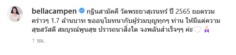 ทั้งนี้ สาวเบลล่าก็ถือว่าเป็นอีกหนึ่งคนที่ชอบทำบุญอยู่บ่อยๆ อย่างล่าสุดก็ได้เป็นเจ้าภาพทอดกฐินที่ วัดพระยาสุเรนทร์ โดยได้โพสต์ในอินสตาแกรมระบุว่า