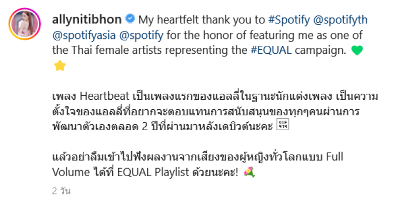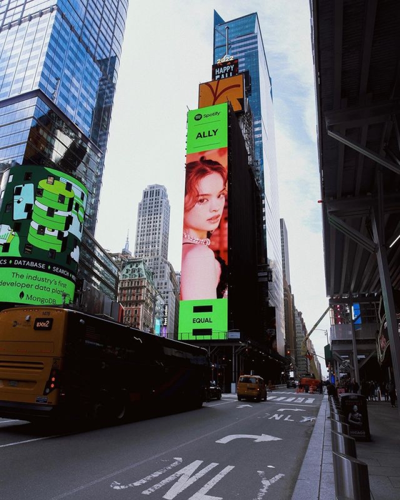 ล่าสุดในอินสตาแกรมของน้องแอลลี่ ก็ได้มีการโพสต์ภาพตัวเอง ที่ได้ขึ้นบิลบอร์ด ใจกลางไทม์สแควร์ นิวยอร์ก โดยแอลลี่ได้โพสต์ขอบคุณที่เลือกเธอเข้าแคมเปญพร้อมข้อความว่า เพลง Heartbeat เป็นเพลงแรกของแอลลี่ในฐานะนักแต่งเพลง เป็นความตั้งใจของแอลลี่ที่อยากจะตอบแทนการสนับสนุนของทุกๆ คนผ่านการพัฒนาตัวเองตลอด 2 ปีที่ผ่านมาหลังเดบิวต์นะคะ แล้วอย่าลืมเข้าไปฟังผลงานจากเสียงของผู้หญิงทั่วโลกแบบ Full Volume ได้ที่ EQUAL Playlist ด้วยนะคะ