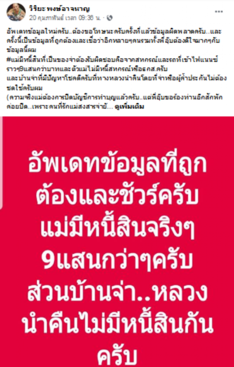 ล่าสุดทางด้าน เฟสบุ๊คที่ใช้ชื่อว่า วิริยะ พงษ์อาจหาญ ได้โพสต์ข้อความที่คนเข้าใจผิดกันทั้งประเทศ สำหรับหนี้สินของจ่าจักรที่จริงแล้วไม่ใช่1.9ล้านบาท แต่คือ9แสนกว่าๆเท่านั้น โดยได้โพสต์ระบุข้อความว่า